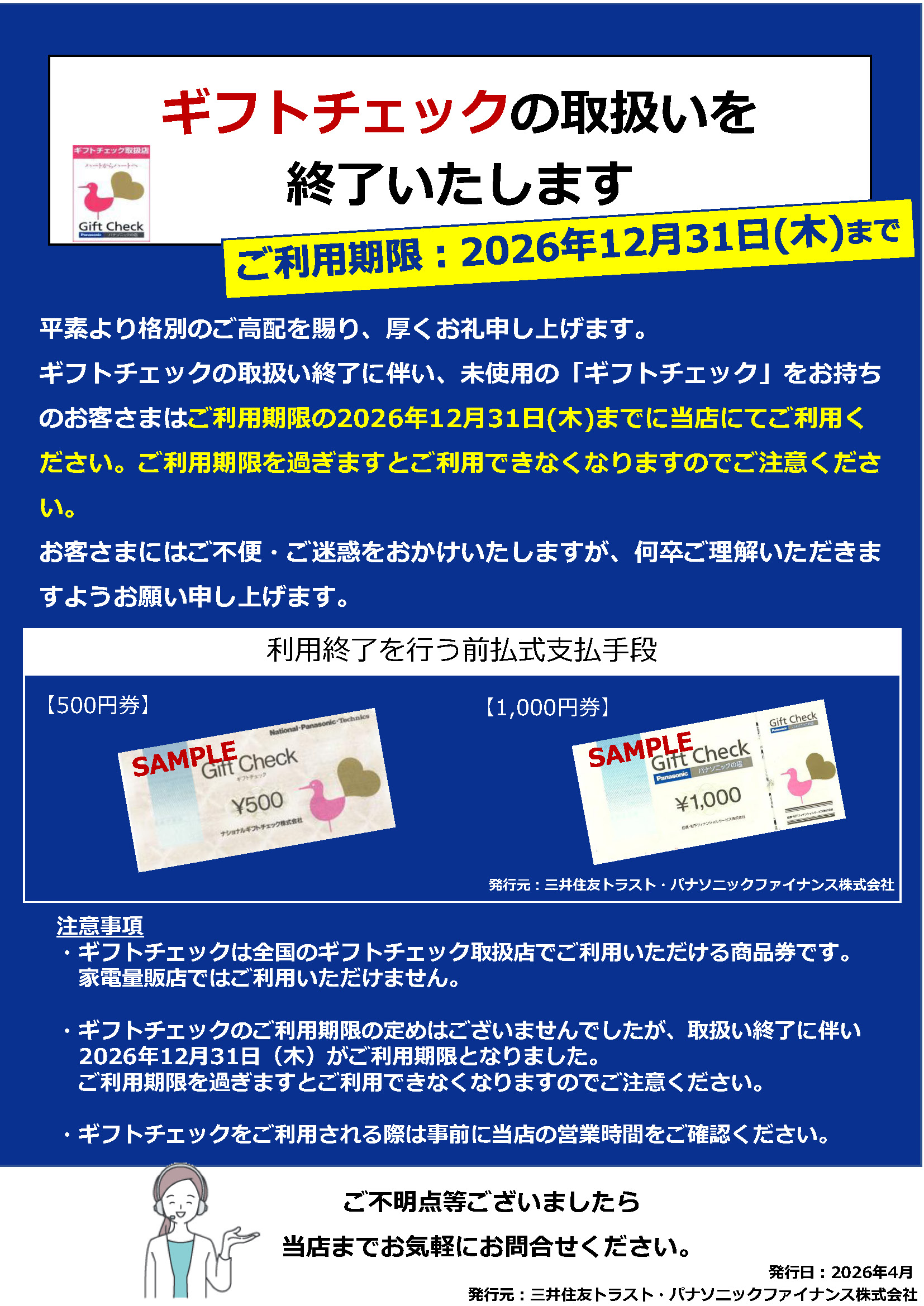 未使用の「ギフトチェック」をお持ちのお客さまは下記のご利用期限までに当店にてご利用ください。