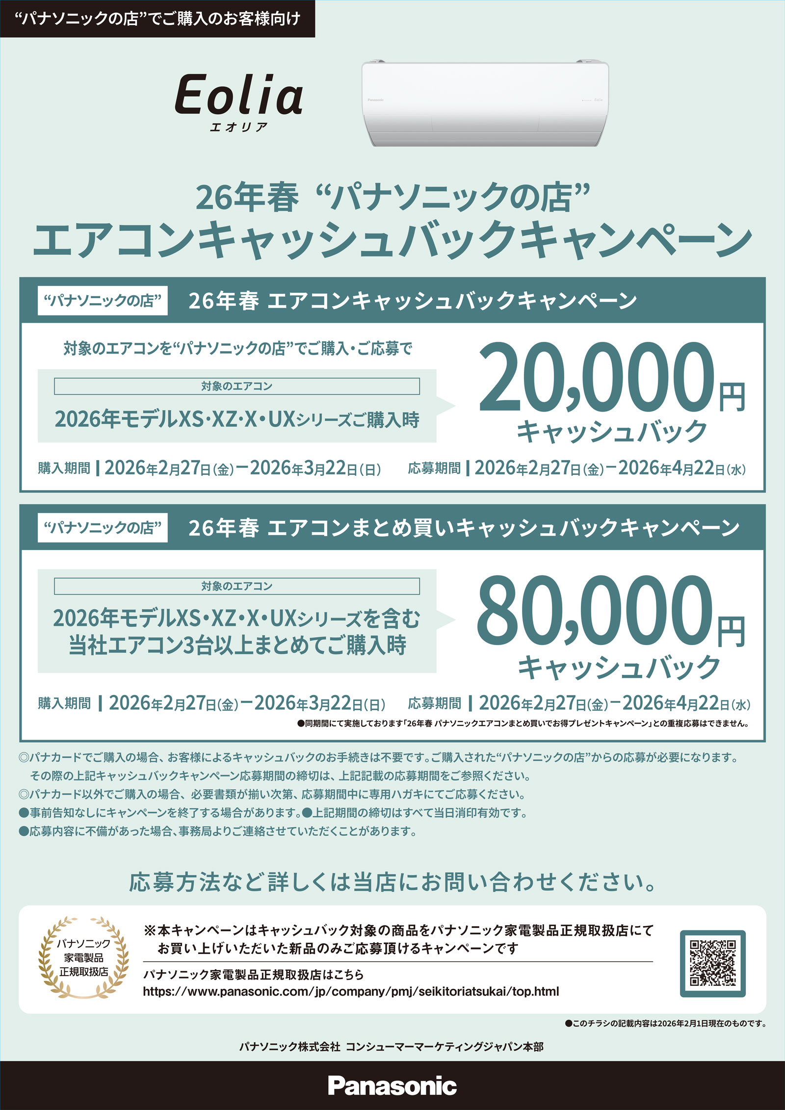 26年春“パナソニックの店”エアコンキャッシュバックキャンペーン