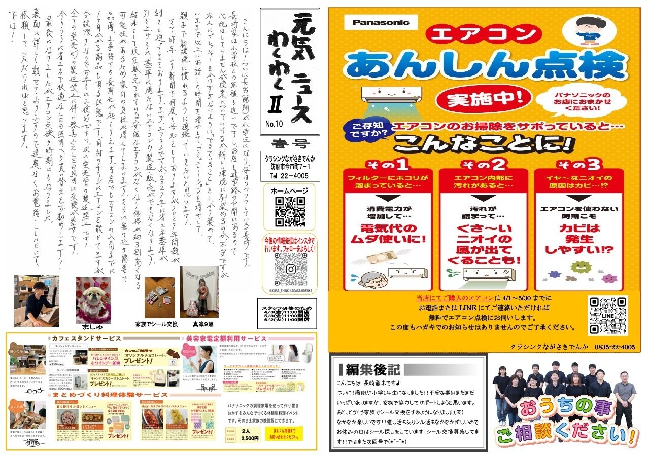 当店にてご購入のエアコンは4/1~5/30までにお電話またはLINEにてご連絡いただければ、無料でエアコン点検にお伺いします。
