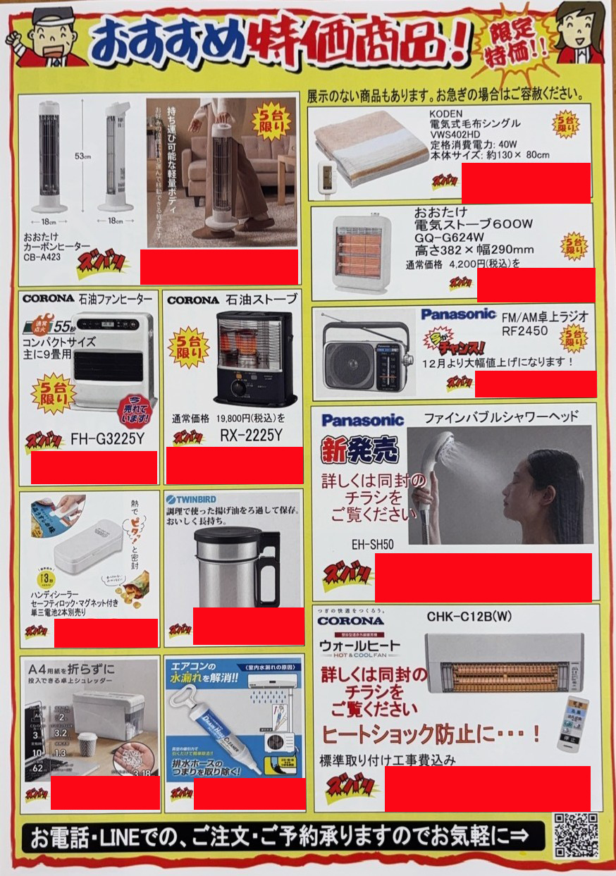 これからの季節に大活躍の暖房器具やファンヒーターから、新発売のファインバブルシャワーヘッドまで。